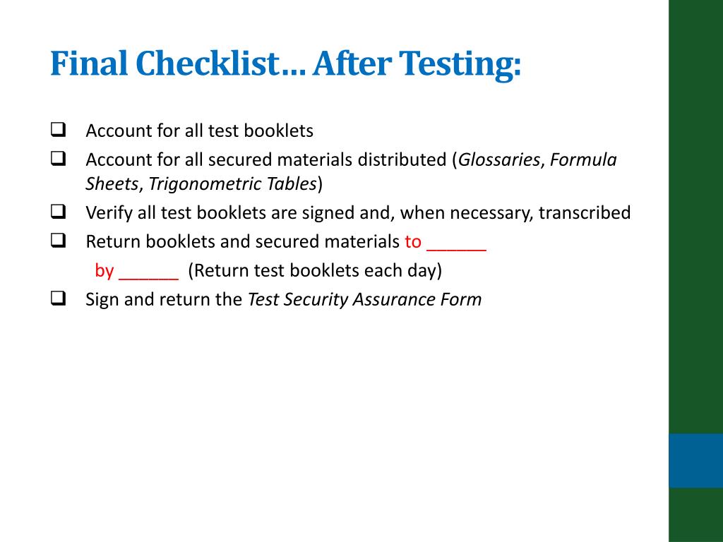 Final Checklist… After Testing: • Account for all test booklets • Account for all secured materials distributed (Glossaries, Formula Sheets, Trigonometric Tables) • Verify all test booklets are signed and, when necessary, transcribed • Return booklets and secured materials to ______ by ______ (Return test booklets each day) • Sign and return the Test Security Assurance Form