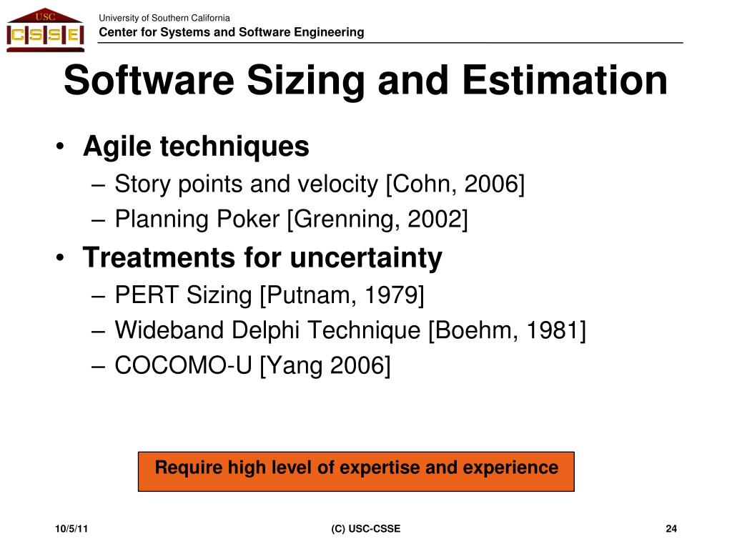 Software Sizing and Estimation • Agile techniques • Story points and velocity [Cohn, 2006] • Planning Poker [Grenning, 2002] • Treatments for uncertainty • PERT Sizing [Putnam, 1979] • Wideband Delphi Technique [Boehm, 1981] • COCOMO-U [Yang 2006] Require high level of expertise and experience (C) USC-CSSE