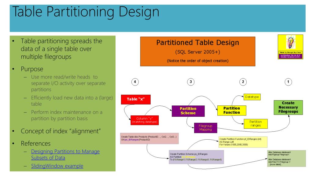 Table Partitioning Design • Table partitioning spreads the data of a single table over multiple filegroups • Purpose • Use more read/write heads to separate I/O activity over separate partitions • Efficiently load new data into a (large) table • Perform index maintenance on a partition by partition basis • Concept of index “alignment” • References • Designing Partitions to Manage Subsets of Data • SlidingWindow example