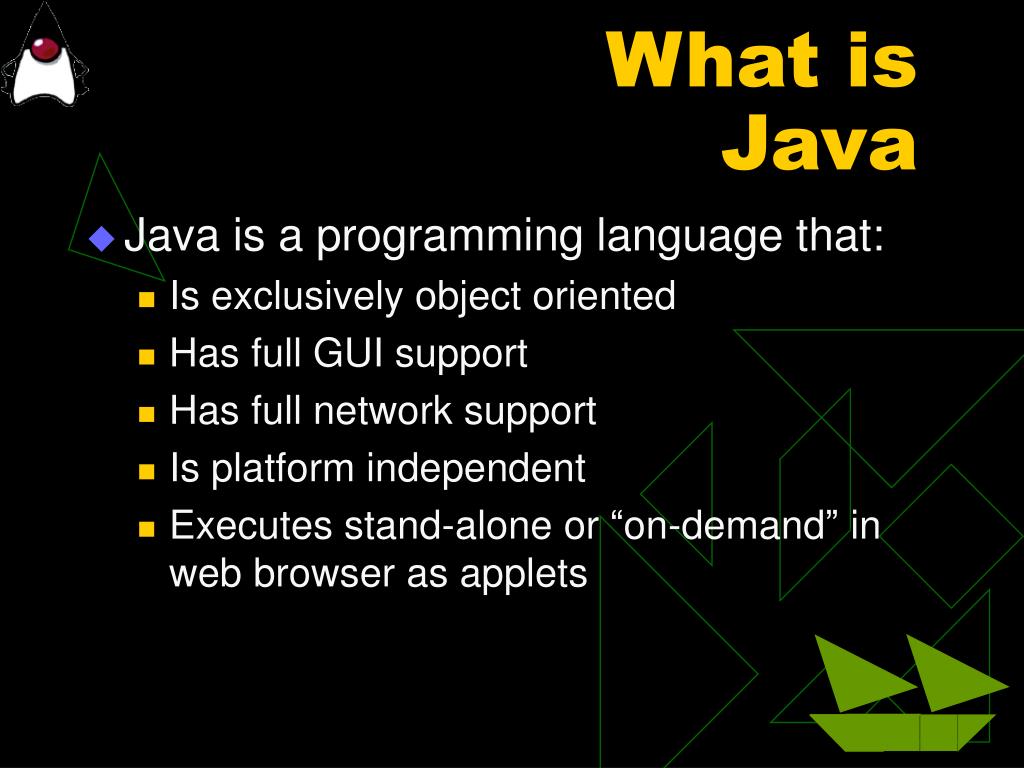 What isJava • Java is a programming language that: • Is exclusively object oriented • Has full GUI support • Has full network support • Is platform independent • Executes stand-alone or “on-demand” in web browser as applets