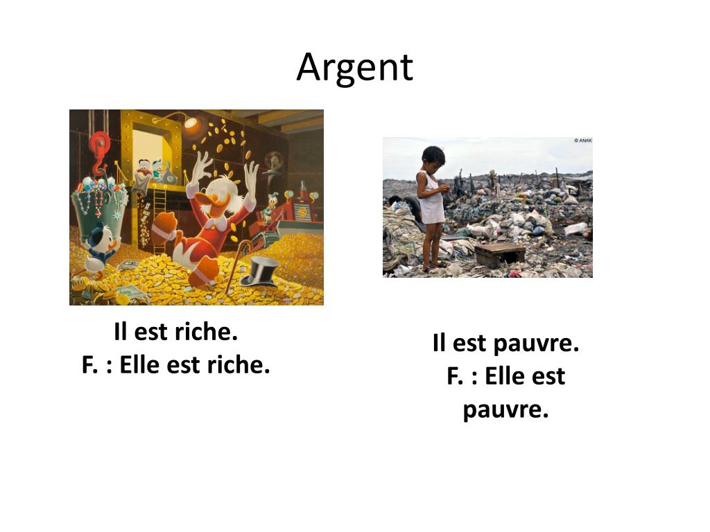 Argent Il est riche.F. : Elle est riche. Il est pauvre.F. : Elle est pauvre.