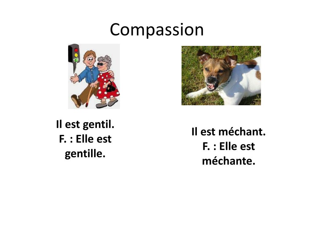 Compassion Il est gentil.F. : Elle est gentille. Il est méchant.F. : Elle est méchante.