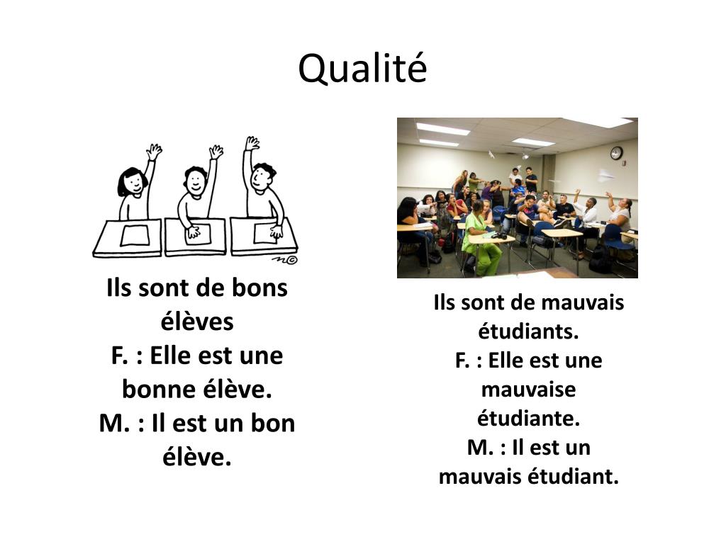 Qualité Ils sont de bons élèvesF. : Elle est une bonne élève.M. : Il est un bon élève. Ils sont de mauvais étudiants.F. : Elle est une mauvaise étudiante.M. : Il est un mauvais étudiant.