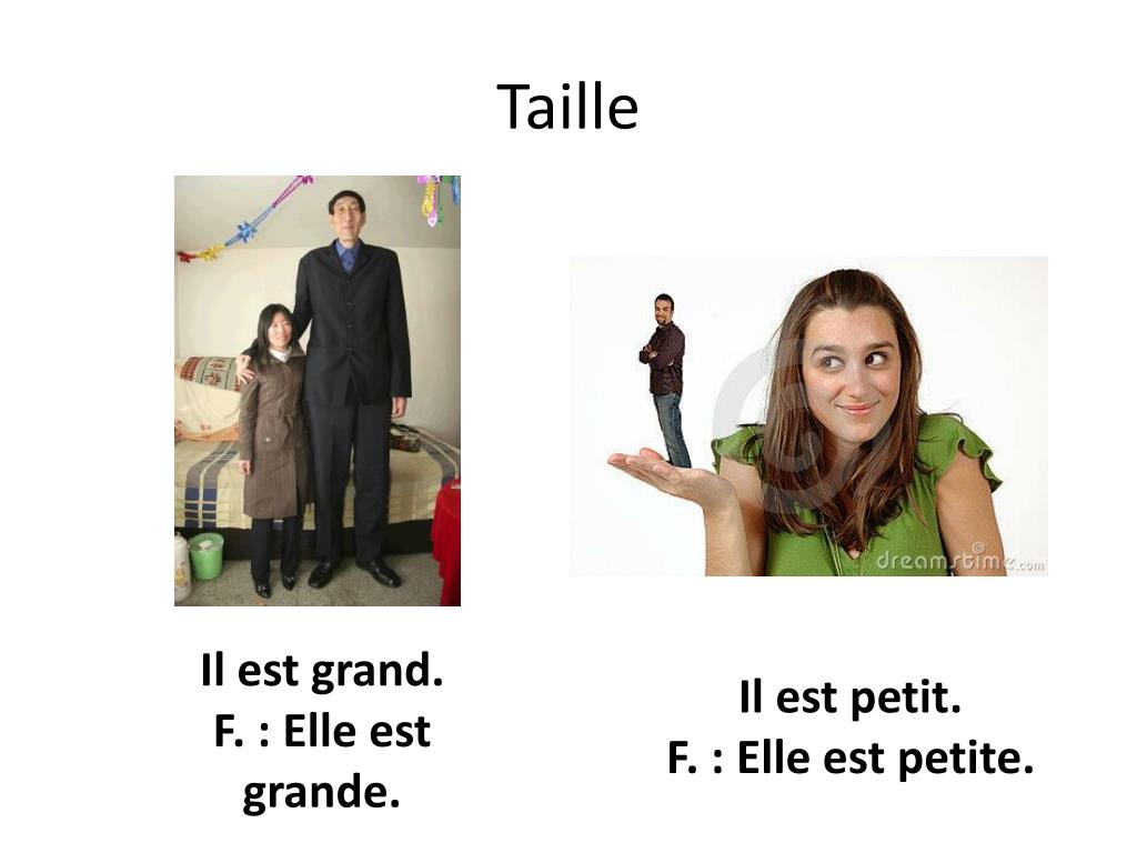 Taille Il est grand.F. : Elle est grande. Il est petit.F. : Elle est petite.