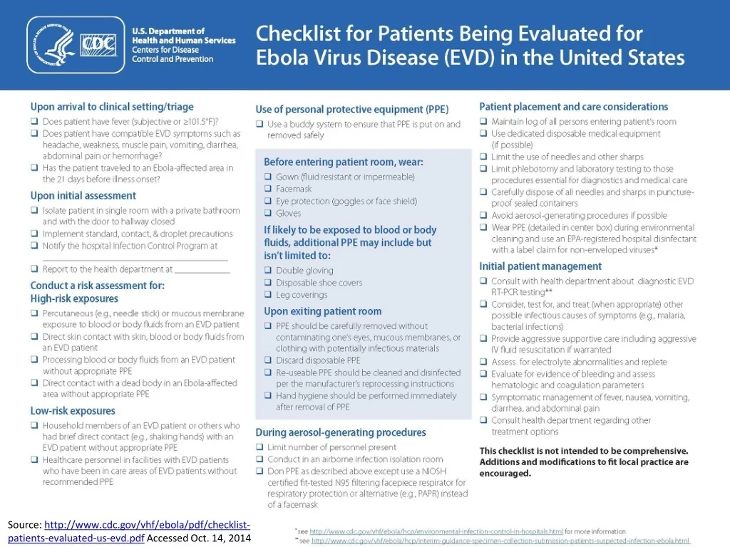 Source: http://www.cdc.gov/vhf/ebola/pdf/checklist-patients-evaluated-us-evd.pdf Accessed Oct. 14, 2014