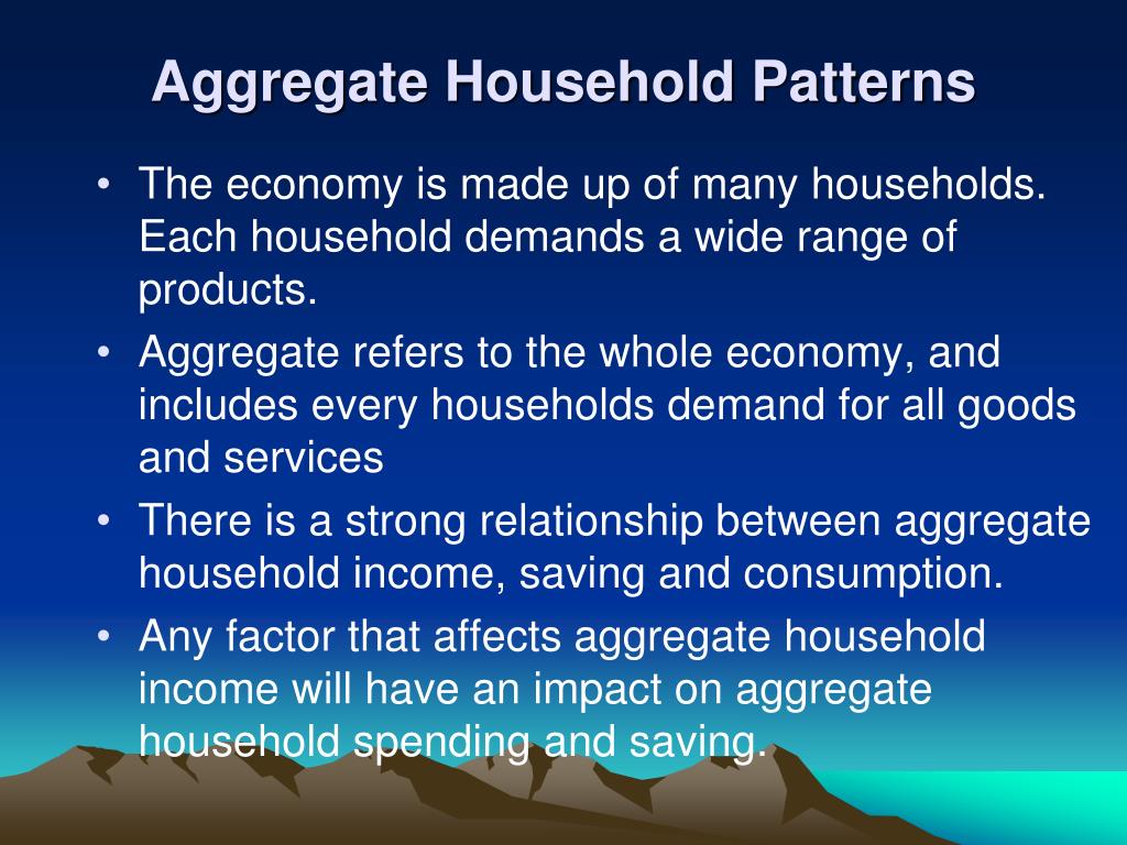 Aggregate Household Patterns • The economy is made up of many households. Each household demands a wide range of products. • Aggregate refers to the whole economy, and includes every households demand for all goods and services • There is a strong relationship between aggregate household income, saving and consumption. • Any factor that affects aggregate household income will have an impact on aggregate household spending and saving.