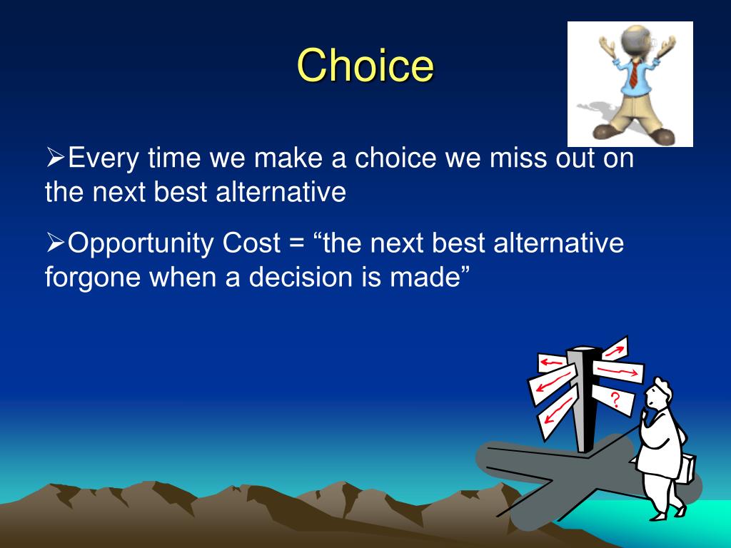 Choice • Every time we make a choice we miss out on the next best alternative • Opportunity Cost = “the next best alternative forgone when a decision is made”