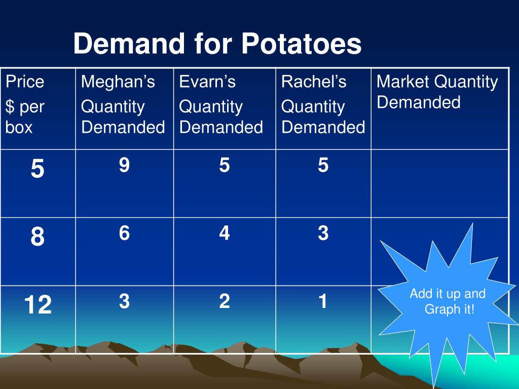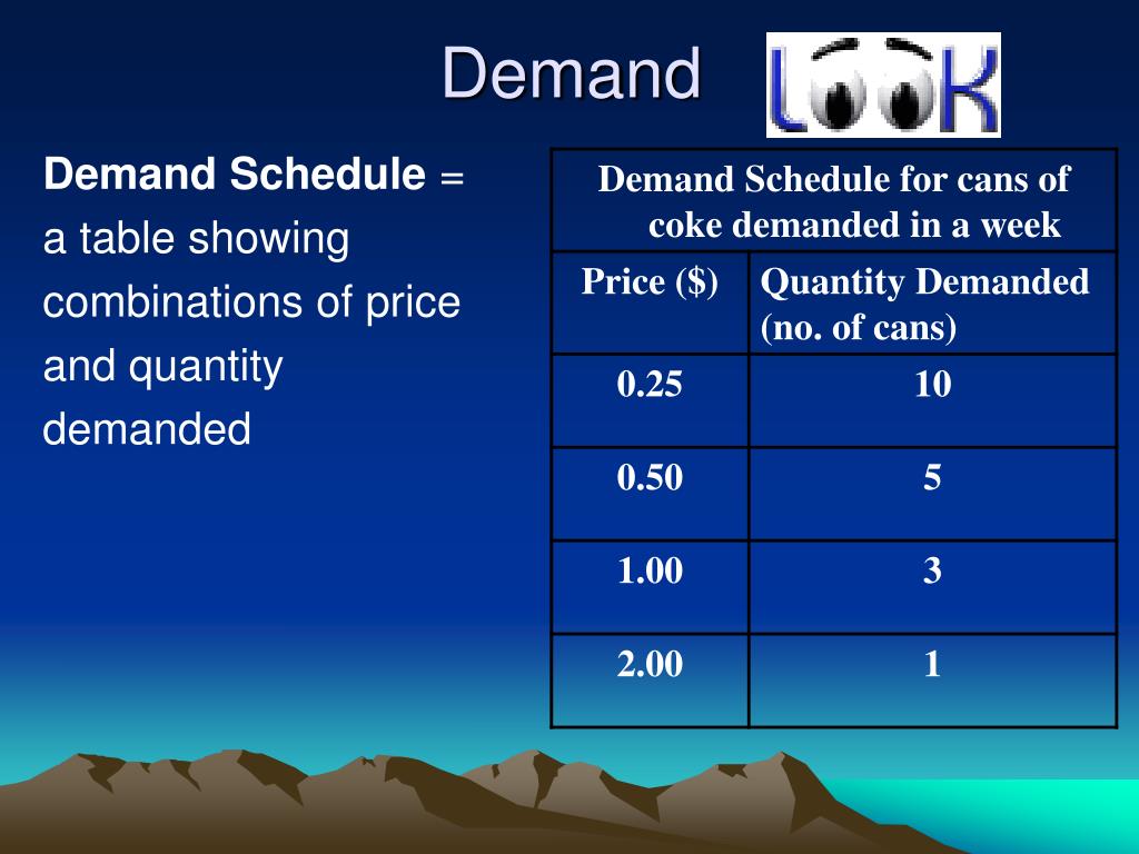 Demand Demand Schedule = a table showing combinations of price and quantity demanded