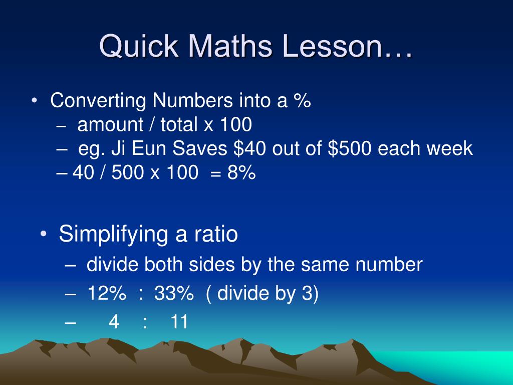 Quick Maths Lesson… • Converting Numbers into a % • amount / total x 100 • eg. Ji Eun Saves $40 out of $500 each week • 40 / 500 x 100 = 8% • Simplifying a ratio • divide both sides by the same number • 12% : 33% ( divide by 3) • 4 : 11