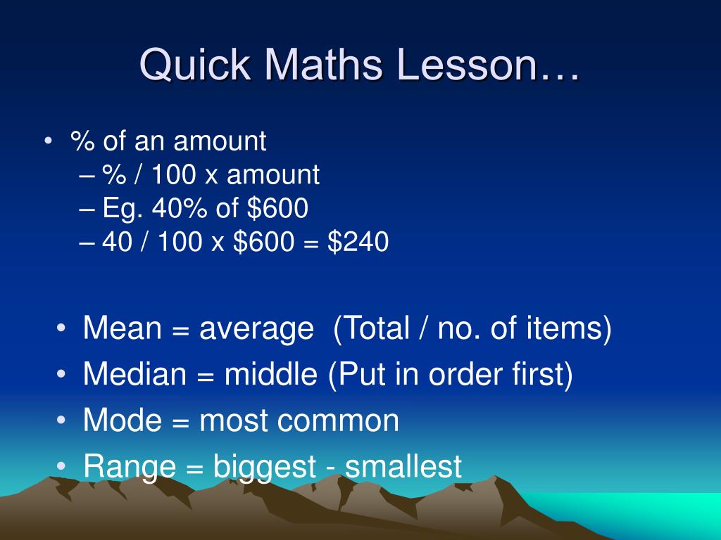 Quick Maths Lesson… • % of an amount • % / 100 x amount • Eg. 40% of $600 • 40 / 100 x $600 = $240 • Mean = average (Total / no. of items) • Median = middle (Put in order first) • Mode = most common • Range = biggest - smallest