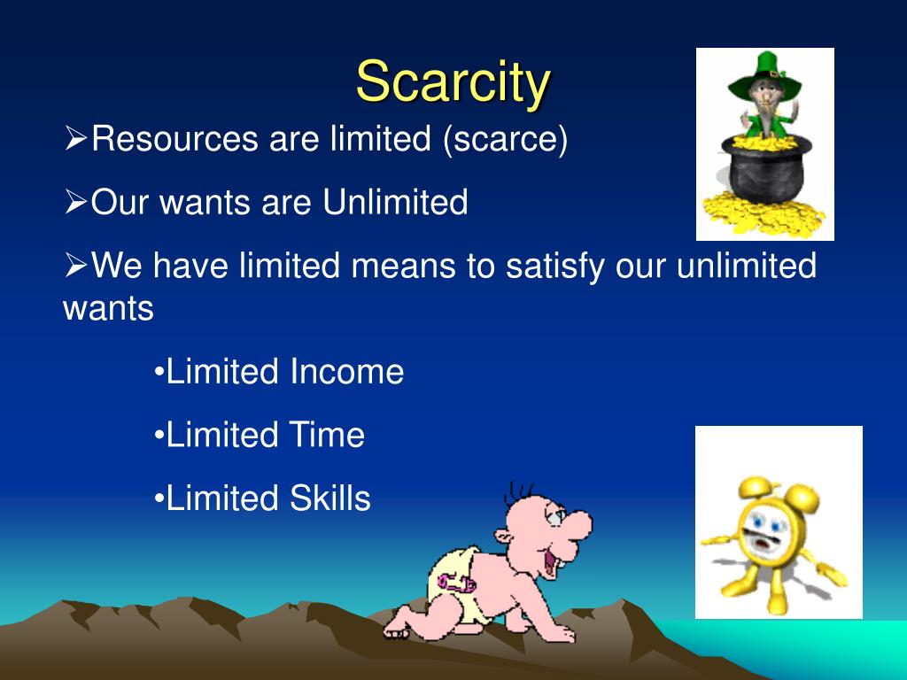 Scarcity • Resources are limited (scarce) • Our wants are Unlimited • We have limited means to satisfy our unlimited wants • Limited Income • Limited Time • Limited Skills