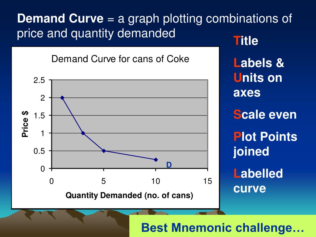 Demand Curve = a graph plotting combinations of price and quantity demanded Title Labels & Units on axes Scale even Plot Points joined Labelled curve D Best Mnemonic challenge…
