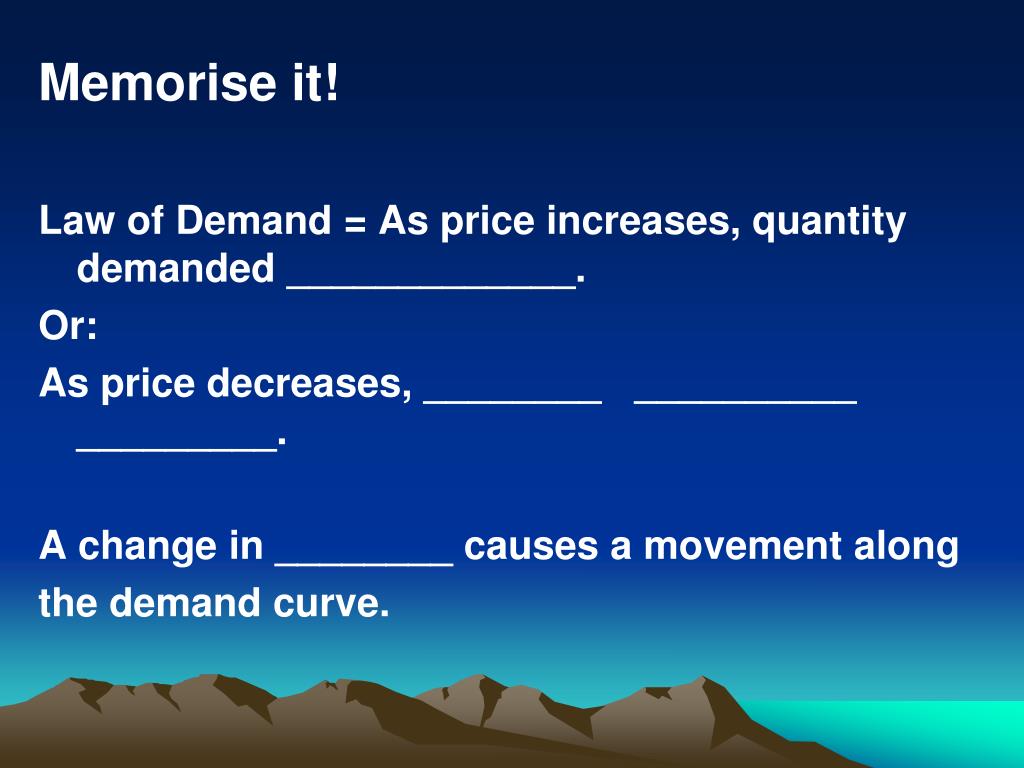Memorise it! Law of Demand = As price increases, quantity demanded _____________. Or: As price decreases, ________ __________ _________. A change in ________ causes a movement along the demand curve.