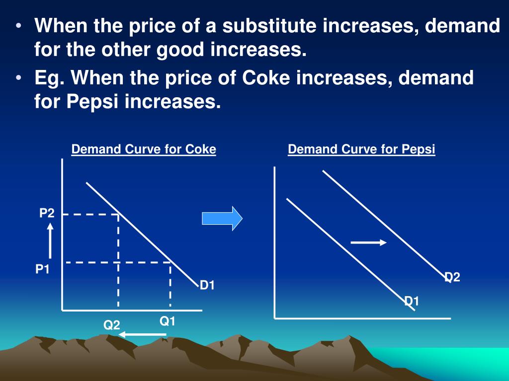 When the price of a substitute increases, demand for the other good increases. • Eg. When the price of Coke increases, demand for Pepsi increases. Demand Curve for Coke Demand Curve for Pepsi P2 P1 D2 D1 D1 Q1 Q2