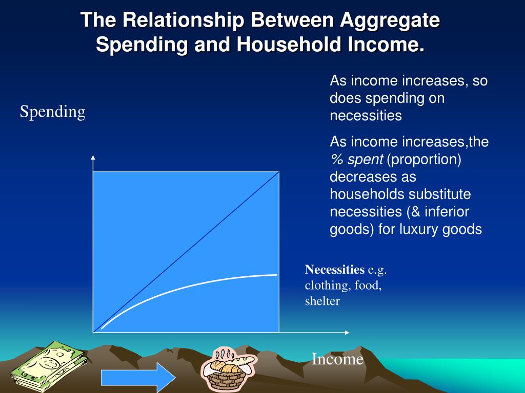 The Relationship Between Aggregate Spending and Household Income. As income increases, so does spending on necessities As income increases,the % spent (proportion) decreases as households substitute necessities (& inferior goods) for luxury goods Spending Necessities e.g. clothing, food, shelter Income