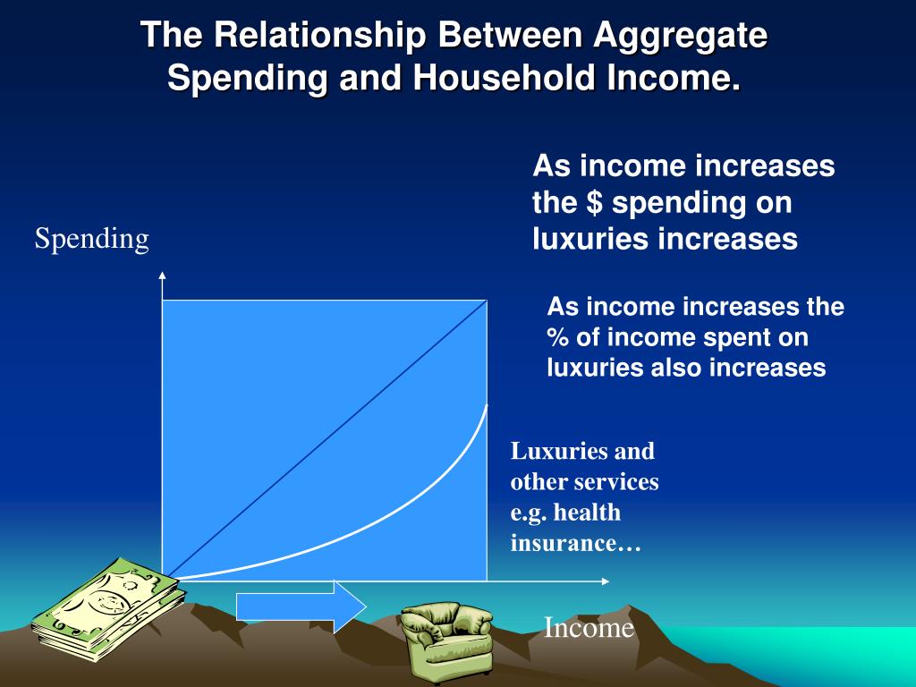 The Relationship Between Aggregate Spending and Household Income. As income increases the $ spending on luxuries increases Spending As income increases the % of income spent on luxuries also increases Luxuries and other services e.g. health insurance… Income