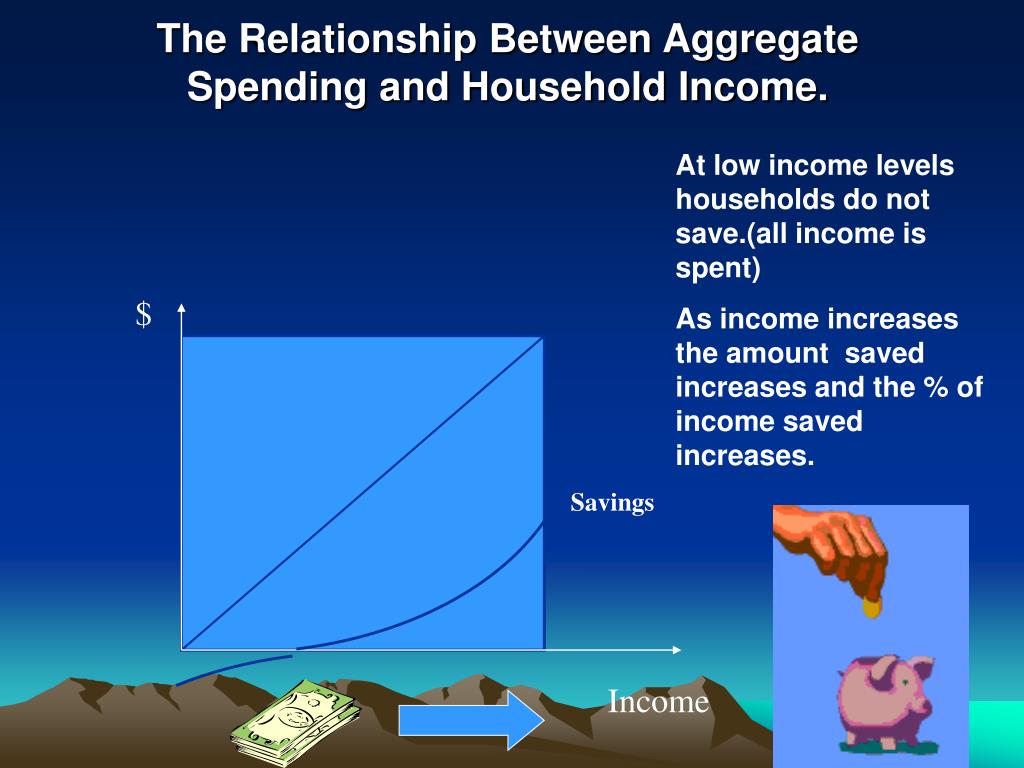 The Relationship Between Aggregate Spending and Household Income. At low income levels households do not save.(all income is spent) As income increases the amount saved increases and the % of income saved increases. $ Savings Income