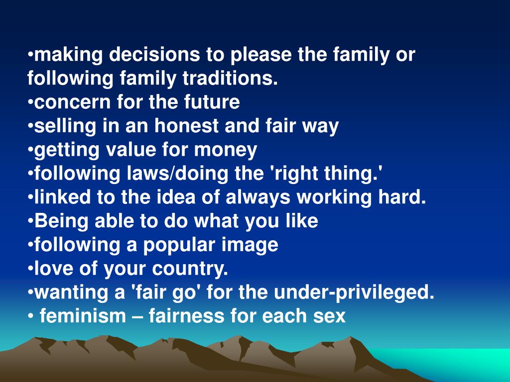 making decisions to please the family or following family traditions. • concern for the future • selling in an honest and fair way • getting value for money • following laws/doing the 'right thing.' • linked to the idea of always working hard. • Being able to do what you like • following a popular image • love of your country. • wanting a 'fair go' for the under-privileged. • feminism – fairness for each sex