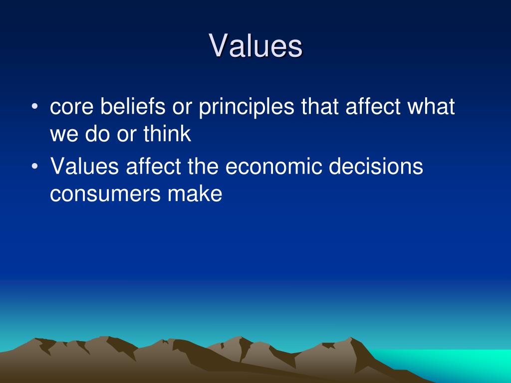 Values • core beliefs or principles that affect what we do or think • Values affect the economic decisions consumers make