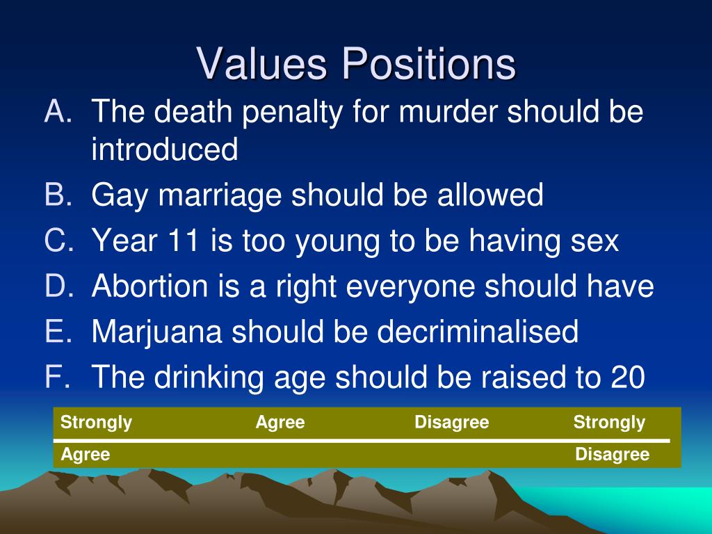 Values Positions • The death penalty for murder should be introduced • Gay marriage should be allowed • Year 11 is too young to be having sex • Abortion is a right everyone should have • Marjuana should be decriminalised • The drinking age should be raised to 20 Strongly Agree Disagree Strongly Agree Disagree