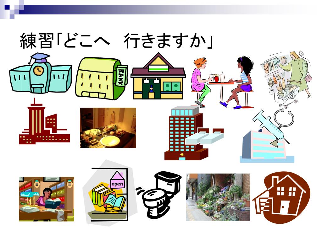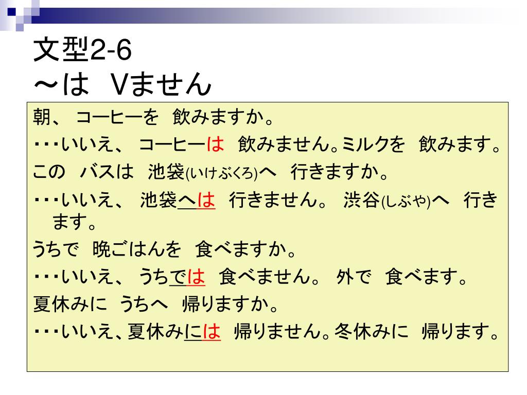 文型2-6~は Vません 朝、 コーヒーを 飲みますか。 ・・・いいえ、 コーヒーは 飲みません。ミルクを 飲みます。 この バスは 池袋(いけぶくろ)へ 行きますか。 ・・・いいえ、 池袋へは 行きません。 渋谷(しぶや)へ 行きます。 うちで 晩ごはんを 食べますか。 ・・・いいえ、 うちでは 食べません。 外で 食べます。 夏休みに うちへ 帰りますか。 ・・・いいえ、夏休みには 帰りません。冬休みに 帰ります。