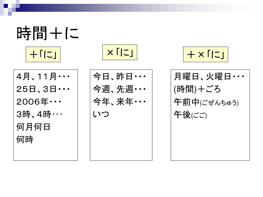 4月、11月・・・ 25日、3日・・・ 2006年・・・ 3時、4時・・・ 何月何日 何時 今日、昨日・・・ 今週、先週・・・ 今年、来年・・・ いつ 時間+に ×「に」 +「に」 +×「に」 月曜日、火曜日・・・ (時間)+ごろ 午前中(ごぜんちゅう) 午後(ごご)