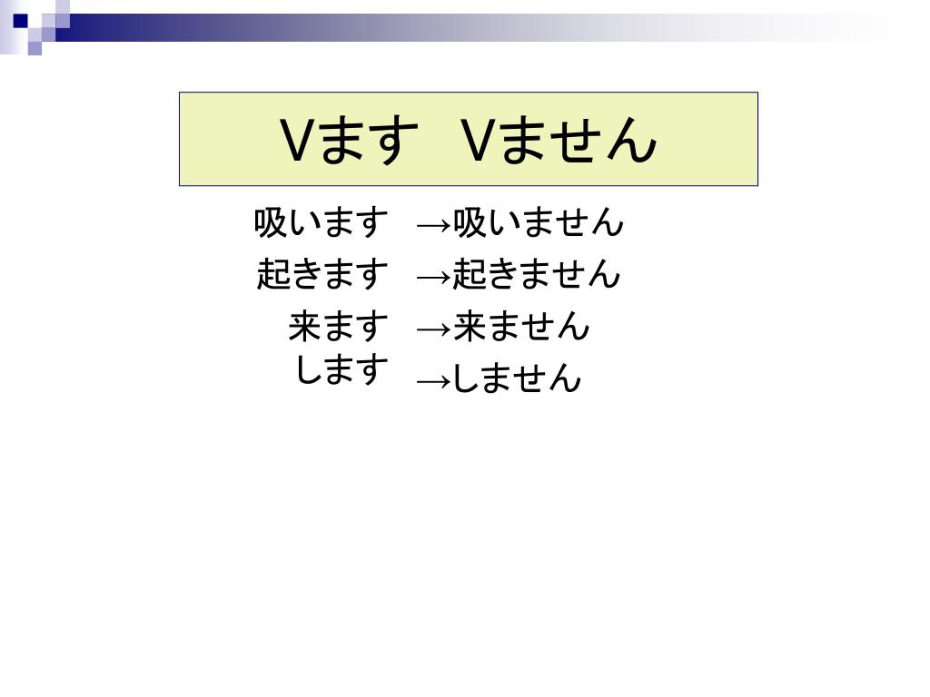 吸います 起きます 来ますします →吸いません →起きません →来ません →しません Vます Vません