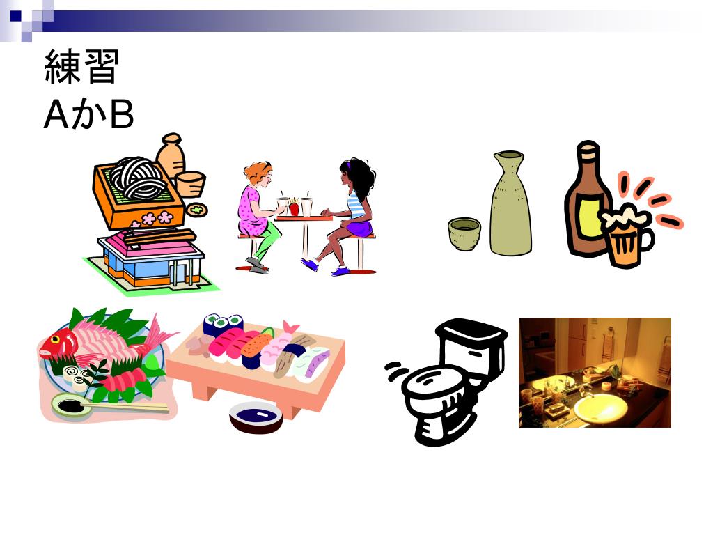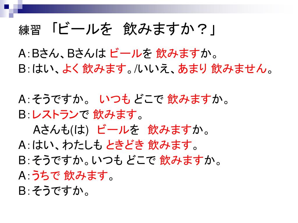 練習「ビールを 飲みますか?」 A:Bさん、Bさんは ビールを 飲みますか。 B:はい、よく 飲みます。/いいえ、あまり飲みません。 A:そうですか。 いつも どこで 飲みますか。 B:レストランで 飲みます。 Aさんも(は)ビールを 飲みますか。 A:はい、わたしも ときどき 飲みます。 B:そうですか。いつも どこで 飲みますか。 A:うちで 飲みます。 B:そうですか。