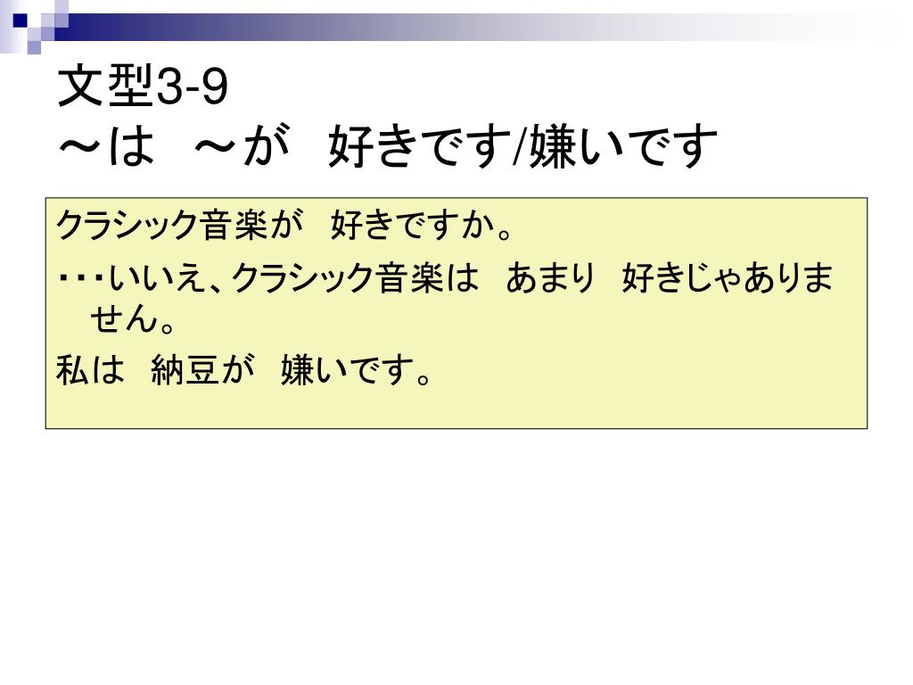 文型3-9 ~は ~が 好きです/嫌いです クラシック音楽が 好きですか。 ・・・いいえ、クラシック音楽は あまり 好きじゃありません。 私は 納豆が 嫌いです。
