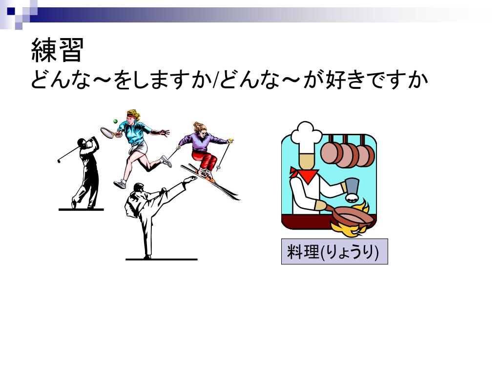 練習どんな~をしますか/どんな~が好きですか練習どんな~をしますか/どんな~が好きですか 料理(りょうり)