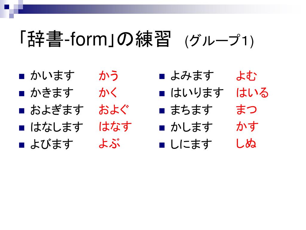 How to make dictionary-form(辞書形 じしょけい)グループ1 まちます かえります のみます あそびます しにます ききます いそぎます はなします かいます →まつ →かえる →のむ →あそぶ →しぬ →きく →いそぐ →はなす →かう いきます iki masu (i →u) いく iku