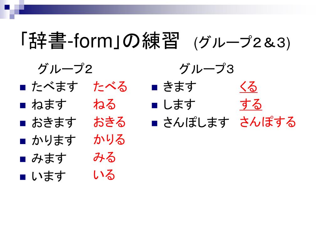 How to make dictionary-form辞書形(じしょけい)グループ2 と グループ3 →たべる みます→みる たべます ねます します きます →ねる ねます→ねる →する します→する →くる きます→くる