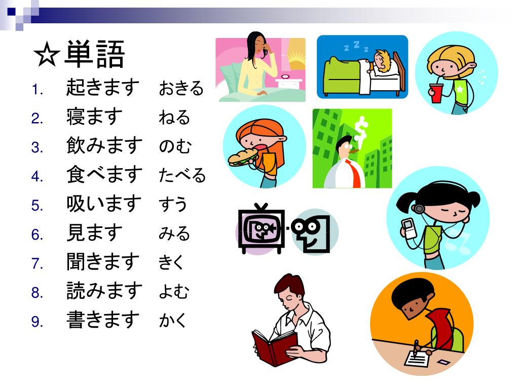 ☆単語 • 起きます おきる • 寝ます ねる • 飲みます のむ • 食べます たべる • 吸います すう • 見ます みる • 聞きます きく • 読みます よむ • 書きます かく