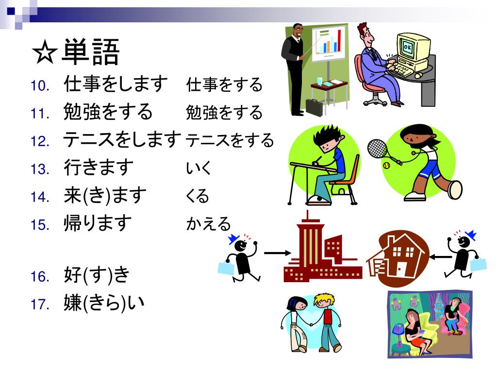 ☆単語 • 仕事をします 仕事をする • 勉強をする 勉強をする • テニスをします テニスをする • 行きます いく • 来(き)ます くる • 帰ります かえる • 好(す)き • 嫌(きら)い