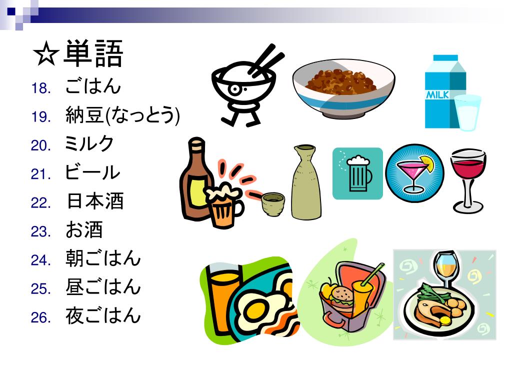 ☆単語 • ごはん • 納豆(なっとう) • ミルク • ビール • 日本酒 • お酒 • 朝ごはん • 昼ごはん • 夜ごはん