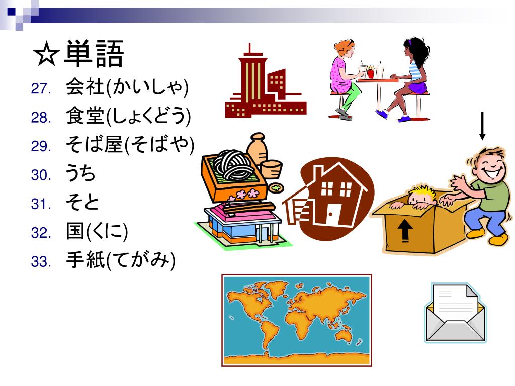 ☆単語 • 会社(かいしゃ) • 食堂(しょくどう) • そば屋(そばや) • うち • そと • 国(くに) • 手紙(てがみ)