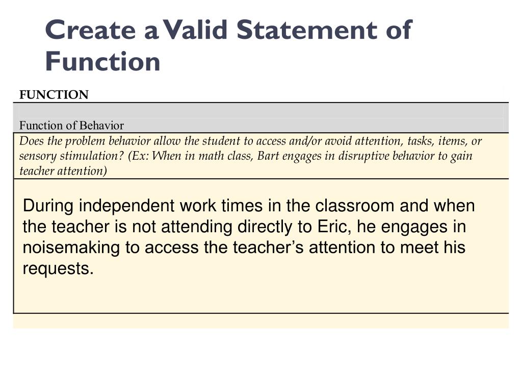 Create a Valid Statement of Function During independent work times in the classroom and when the teacher is not attending directly to Eric, he engages in noisemaking to access the teacher’s attention to meet his requests.