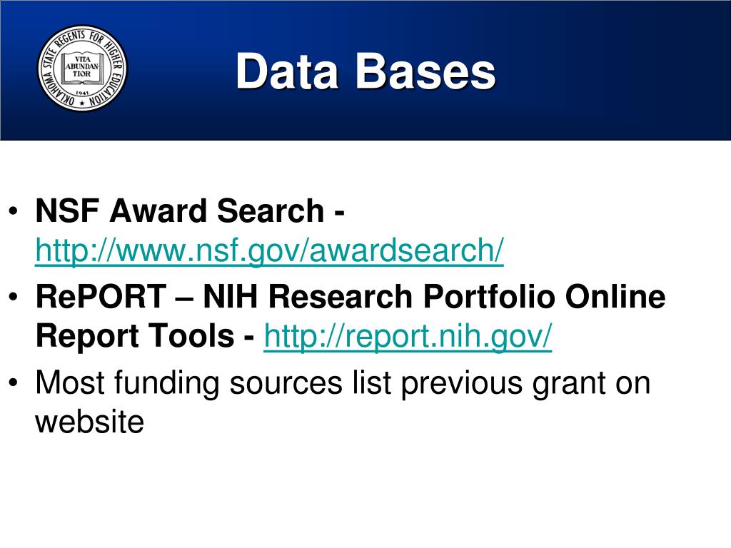 Data Bases • NSF Award Search - http://www.nsf.gov/awardsearch/ • RePORT – NIH Research Portfolio Online Report Tools - http://report.nih.gov/ • Most funding sources list previous grant on website