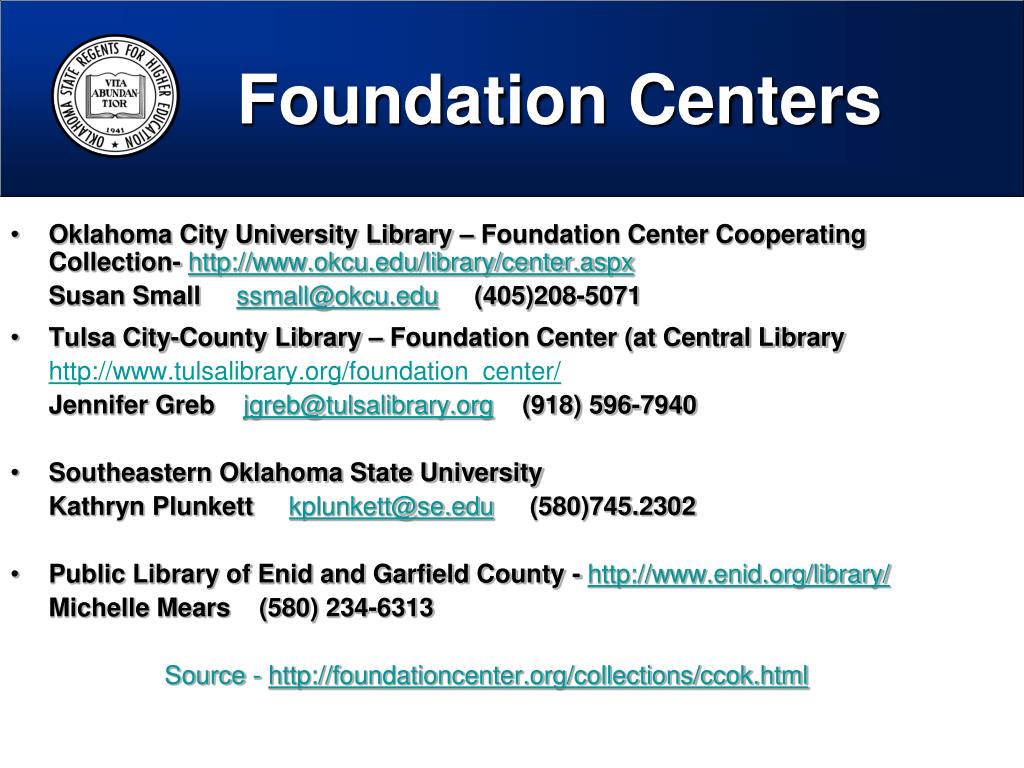 Foundation Centers • Oklahoma City University Library – Foundation Center Cooperating Collection- http://www.okcu.edu/library/center.aspx Susan Small ssmall@okcu.edu(405)208-5071 • Tulsa City-County Library – Foundation Center (at Central Library http://www.tulsalibrary.org/foundation_center/ Jennifer Greb jgreb@tulsalibrary.org (918) 596-7940 • Southeastern Oklahoma State University Kathryn Plunkettkplunkett@se.edu(580)745.2302 • Public Library of Enid and Garfield County - http://www.enid.org/library/ Michelle Mears(580) 234-6313 Source -http://foundationcenter.org/collections/ccok.html