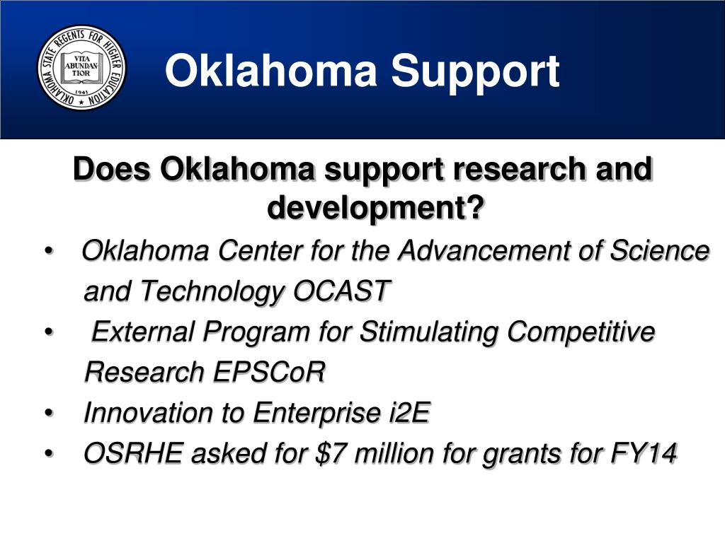 Oklahoma Support Does Oklahomasupport research and development? • Oklahoma Center for the Advancement of Science and Technology OCAST • External Program for Stimulating Competitive Research EPSCoR • Innovation to Enterprise i2E • OSRHE asked for $7 million for grants for FY14