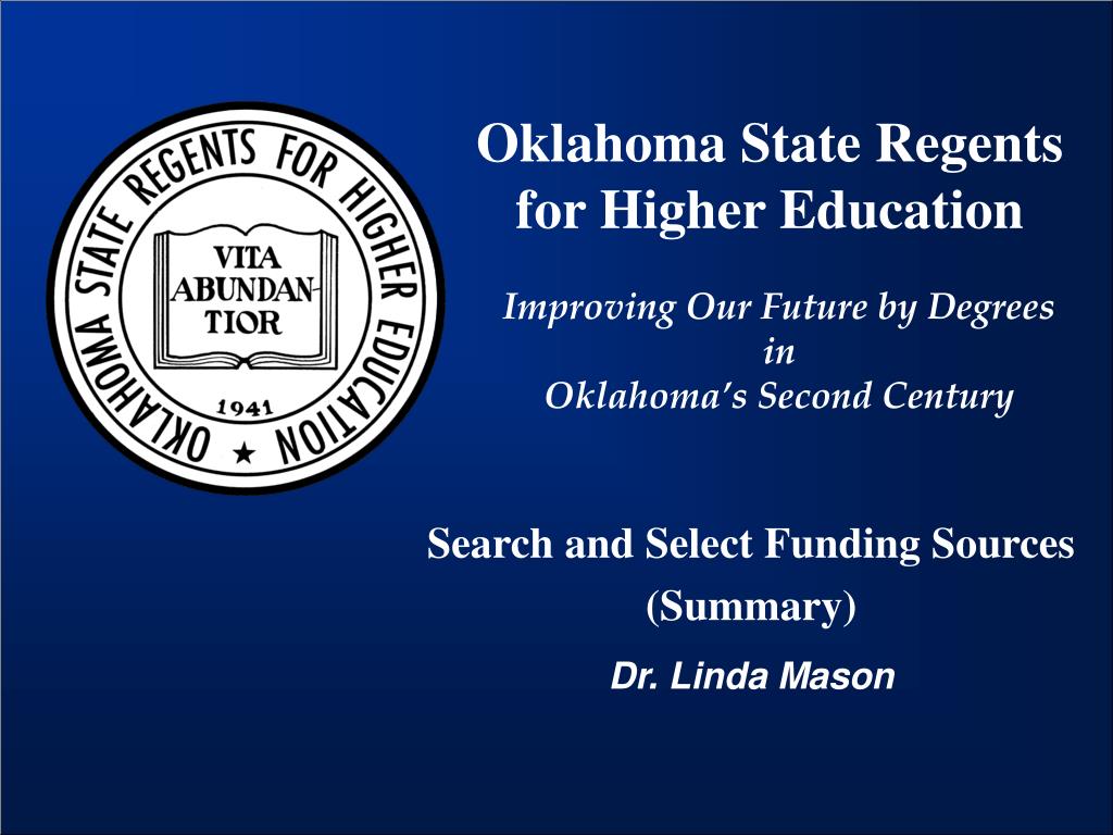 Oklahoma State Regents for Higher Education Improving Our Future by Degrees in Oklahoma’s Second Century Search and Select Funding Sources (Summary) Dr. Linda Mason