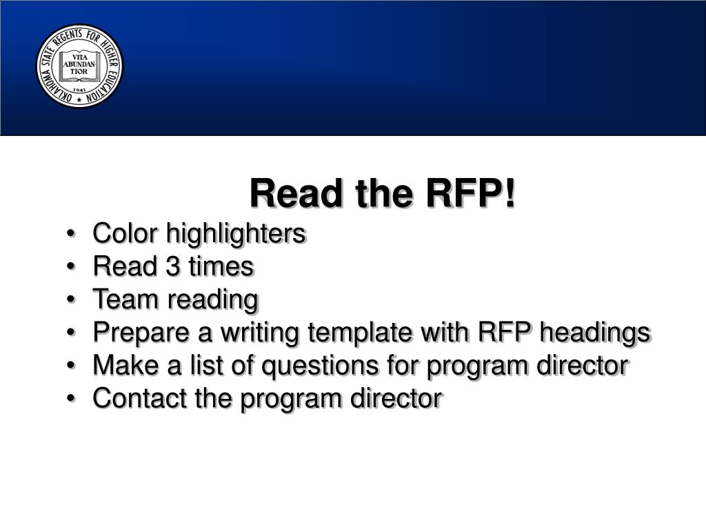 Read the RFP! • Color highlighters • Read 3 times • Team reading • Prepare a writing template with RFP headings • Make a list of questions for program director • Contact the program director