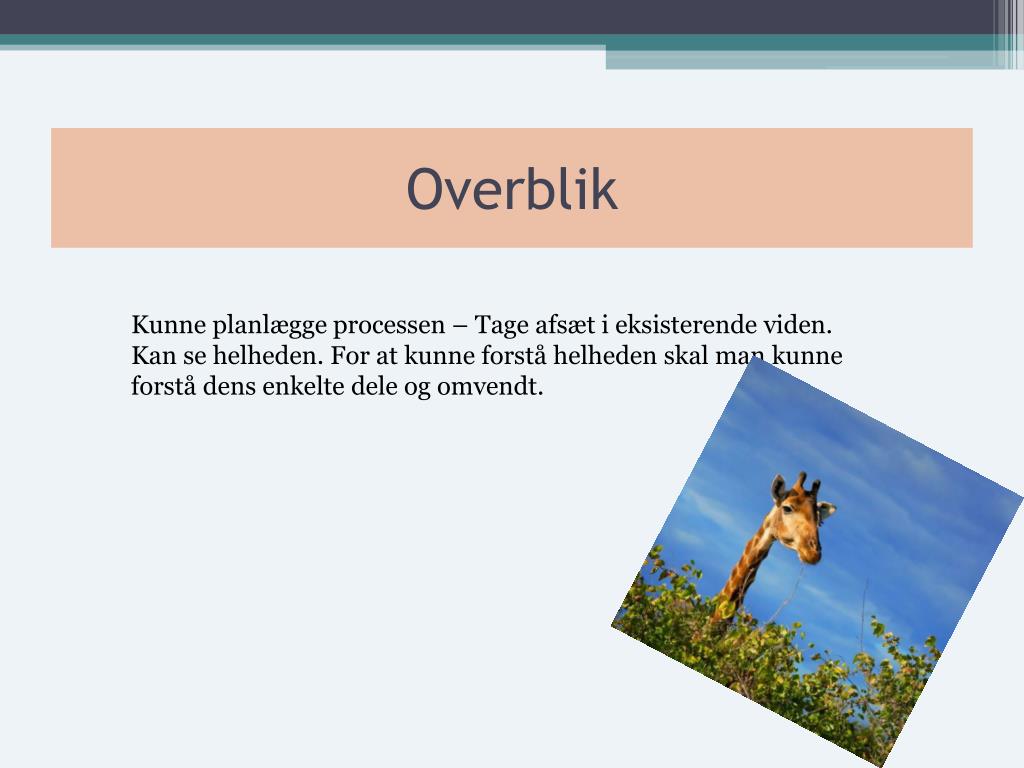 Overblik Kunne planlægge processen – Tage afsæt i eksisterende viden. Kan se helheden. For at kunne forstå helheden skal man kunne forstå dens enkelte dele og omvendt.