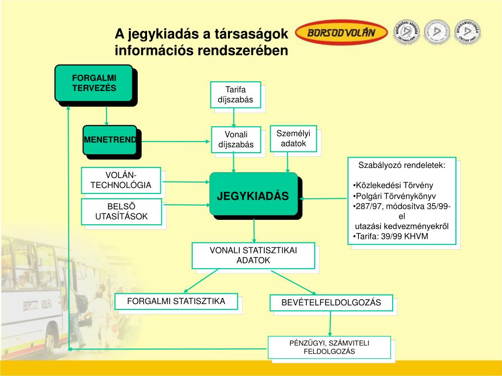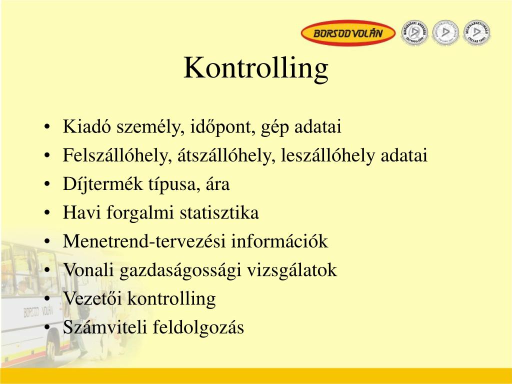 Kontrolling • Kiadó személy, időpont, gép adatai • Felszállóhely, átszállóhely, leszállóhely adatai • Díjtermék típusa, ára • Havi forgalmi statisztika • Menetrend-tervezési információk • Vonali gazdaságossági vizsgálatok • Vezetői kontrolling • Számviteli feldolgozás