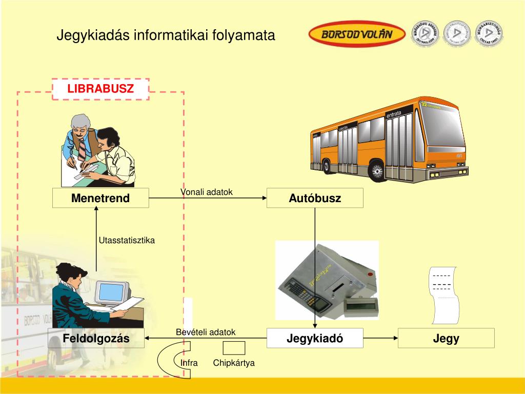 Jegykiadás informatikai folyamata LIBRABUSZ Vonali adatok Menetrend Autóbusz Utasstatisztika Bevételi adatok Feldolgozás Jegykiadó Jegy Infra Chipkártya