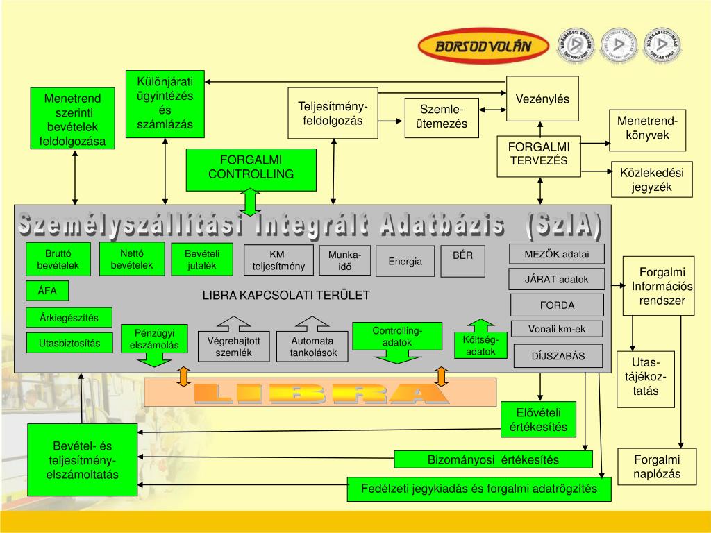 Különjárati ügyintézés és számlázás Vezénylés Menetrend szerinti bevételek feldolgozása Teljesítmény-feldolgozás Szemle-ütemezés Menetrend- könyvek FORGALMI TERVEZÉS FORGALMI CONTROLLING Közlekedési jegyzék Személyszállítási Integrált Adatbázis (SzIA) Nettó bevételek Bruttó bevételek Bevételi jutalék MEZŐK adatai KM-teljesítmény Munka- idő BÉR Energia Forgalmi Információs rendszer JÁRAT adatok ÁFA LIBRA KAPCSOLATI TERÜLET FORDA Árkiegészítés Végrehajtott szemlék Automata tankolások Költség-adatok Vonali km-ek Controlling-adatok Pénzügyi elszámolás Utasbiztosítás DÍJSZABÁS Utas- tájékoz-tatás LIBRA Elővételi értékesítés Bevétel- és teljesítmény-elszámoltatás Forgalmi naplózás Bizományosi értékesítés Fedélzeti jegykiadás és forgalmi adatrögzítés