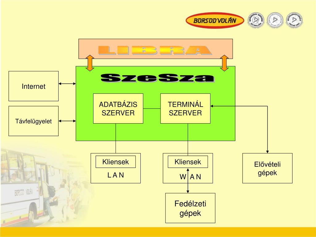 LIBRA Internet SzeSza ADATBÁZISSZERVER TERMINÁL SZERVER Távfelügyelet Elővételi gépek Kliensek Kliensek L A N W A N Fedélzeti gépek