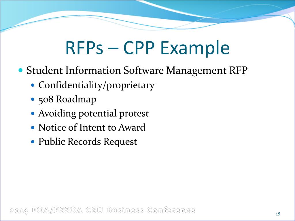 RFPs – CPP Example • Student Information Software Management RFP • Confidentiality/proprietary • 508 Roadmap • Avoiding potential protest • Notice of Intent to Award • Public Records Request