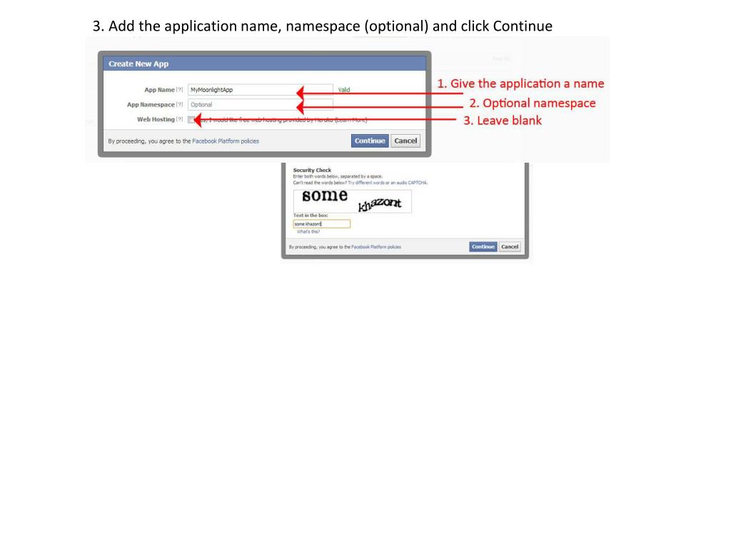 4. On the Basic info tab – the namespace is not necessary to input, but if you create one you can use it as an alternative for the App ID.E.g. http://apps.facebook.com/439441832799664/ would be http://apps.facebook.com/mymoonlightapp/App domain should always be the main hosting domain of the app files.For this application we are using Moonlight hosting, so the hosting ismoonlighthk.com