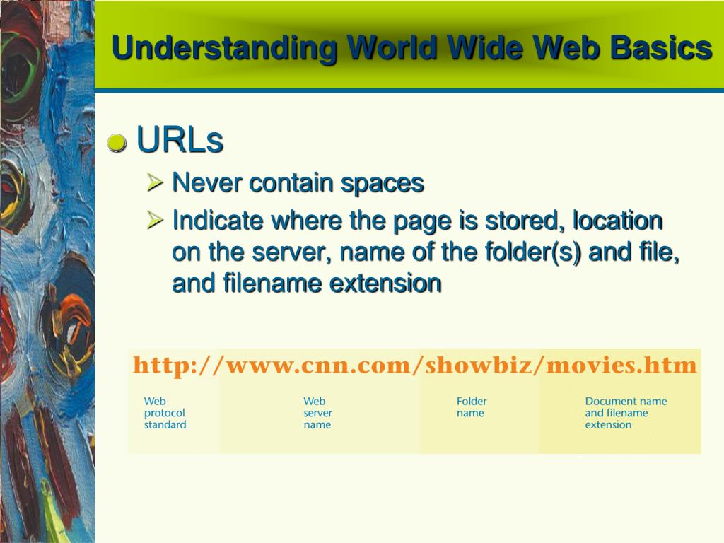 Understanding World Wide Web Basics • URLs • Never contain spaces • Indicate where the page is stored, location on the server, name of the folder(s) and file, and filename extension